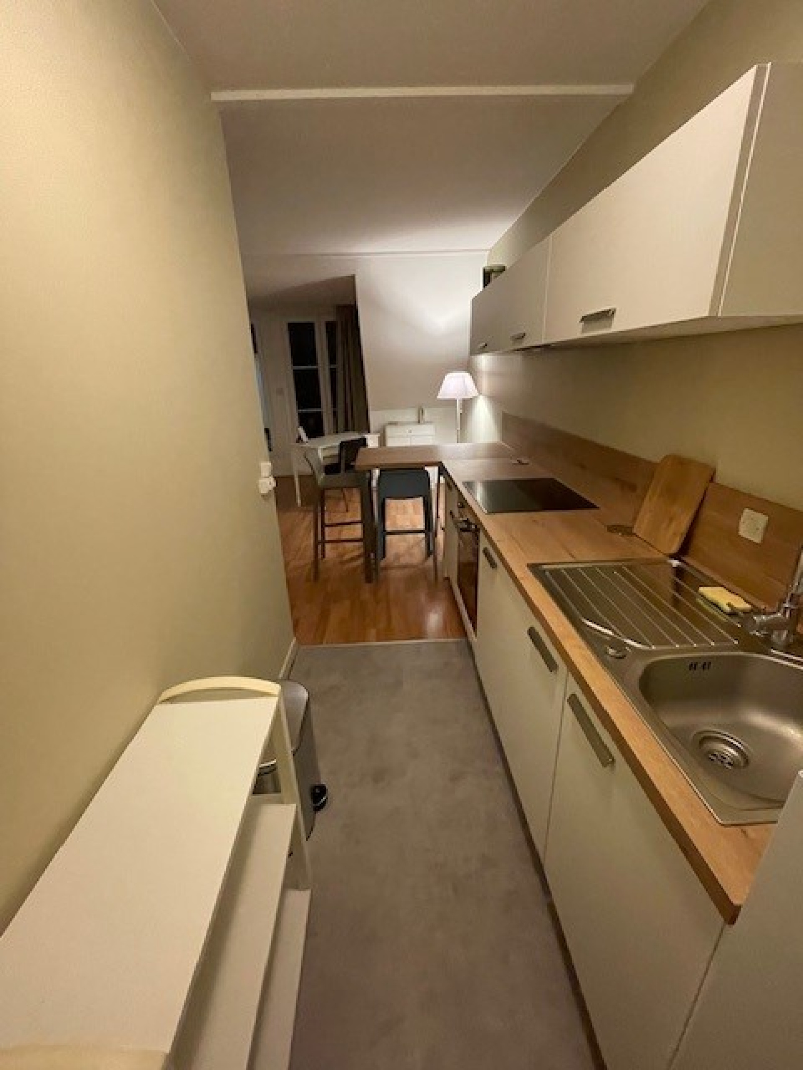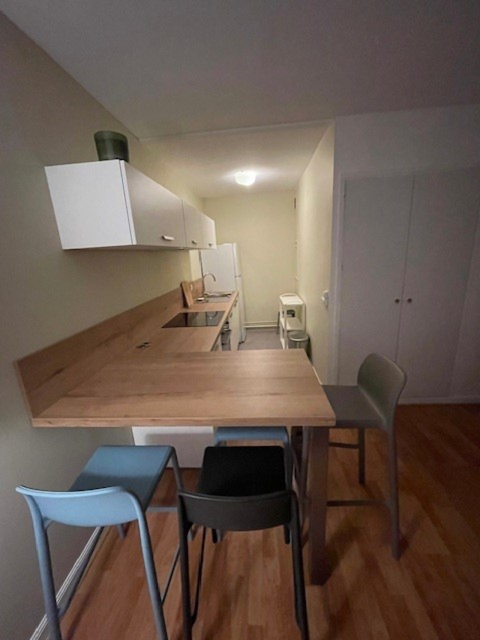Entrée avec placard puis séjour avec cuisine ouverte entièrement équipée et neuve.