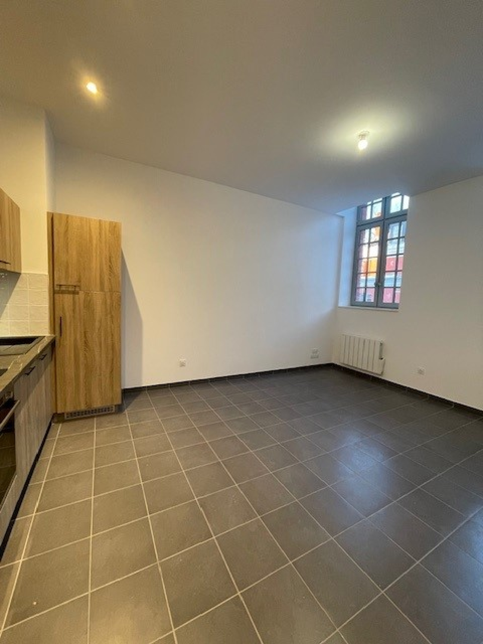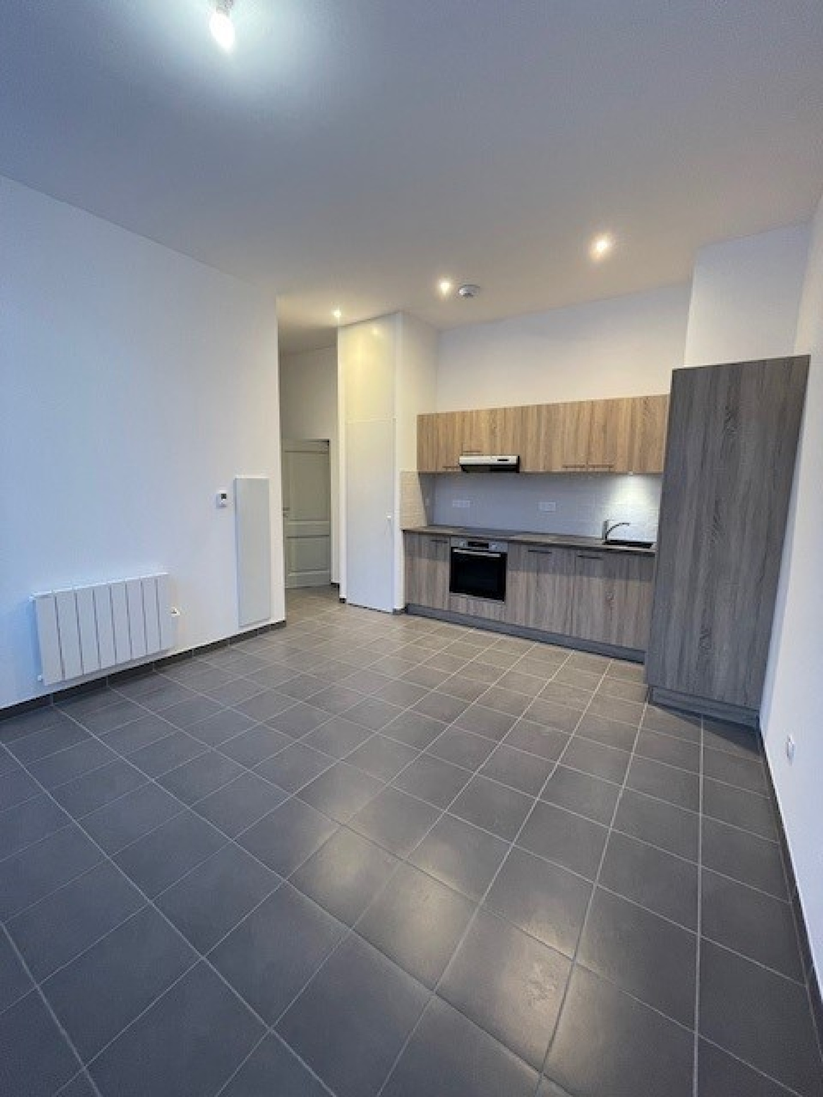 Séjour avec cuisine ouverte équipée.