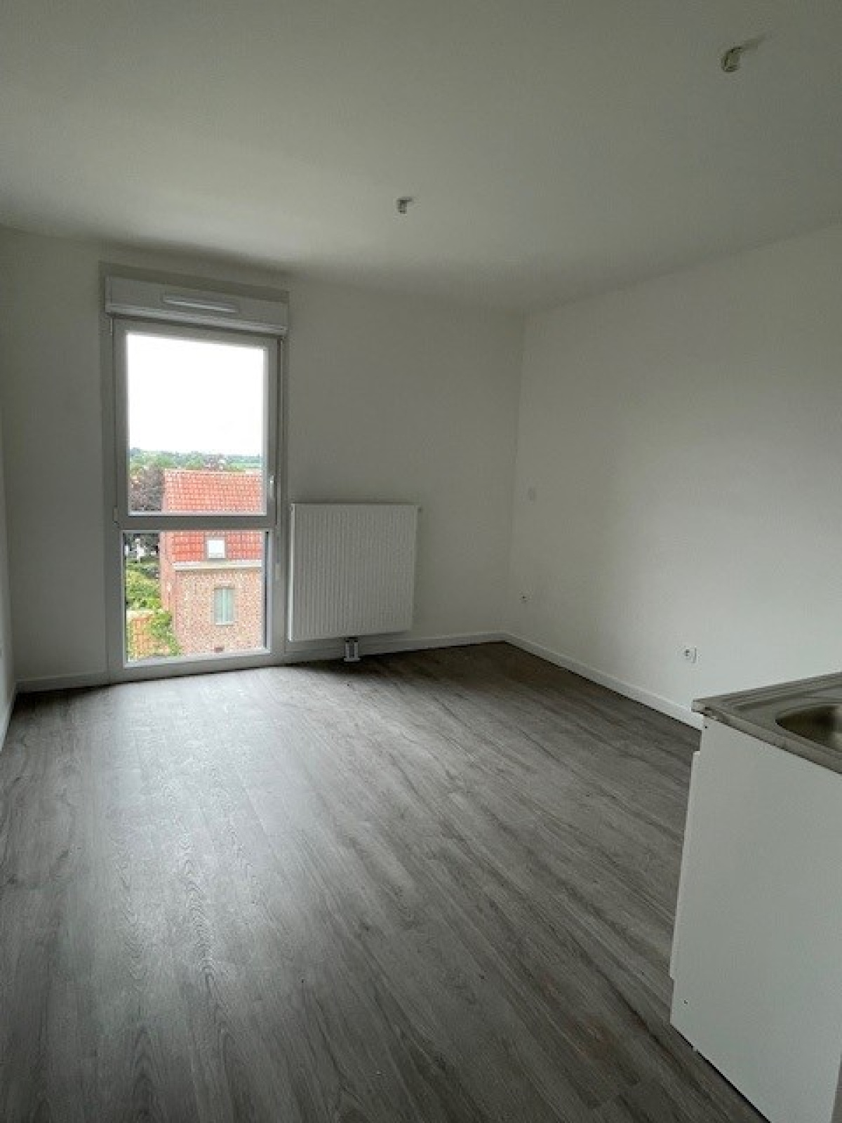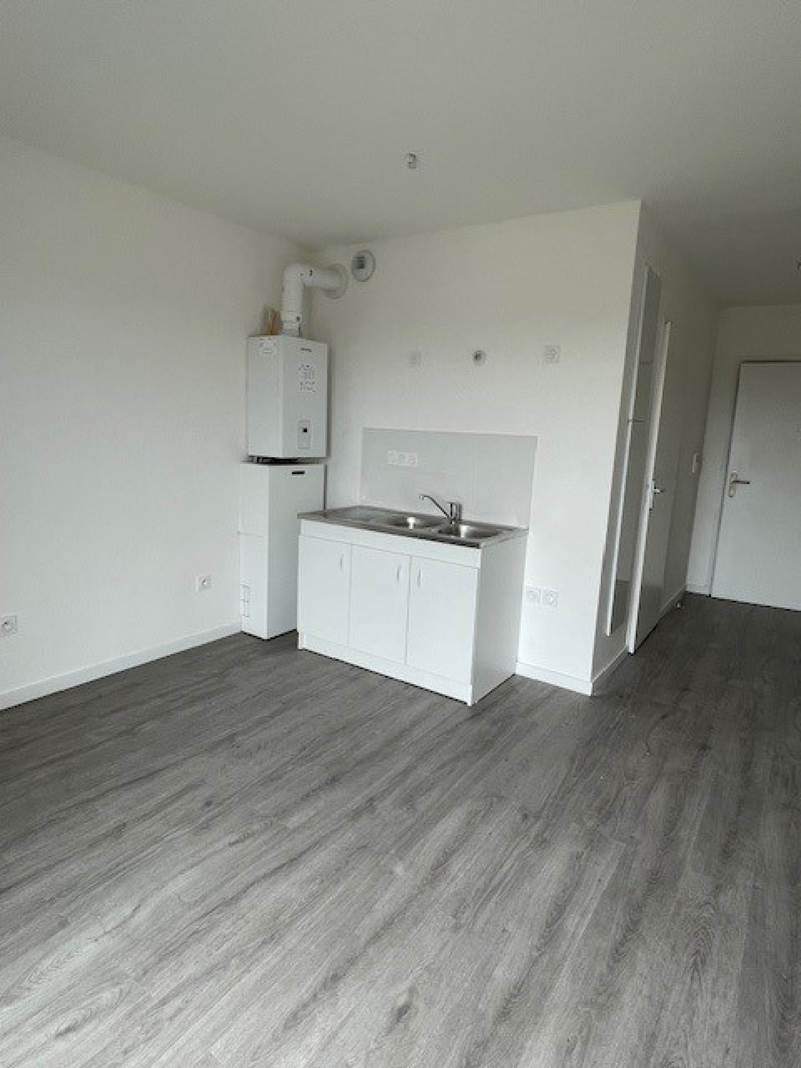 Pièce à vivre avec coin cuisine non équipée.